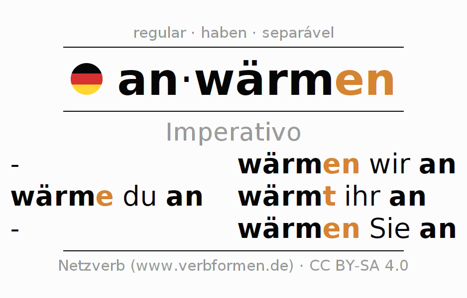 As formas de conjugação do verbo anwärmen (aquecer, esquentar) no imperativo são: wärme (du) an, wärmen wir an, wärmt (ihr) an, wärmen Sie an