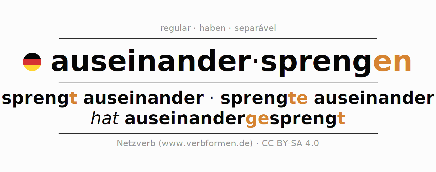 As formas de conjugação do verbo auseinandersprengen (desintegrar, explodir) no imperativo são: sprenge (du) auseinander, sprengen wir auseinander, sprengt (ihr) auseinander, sprengen Sie auseinander