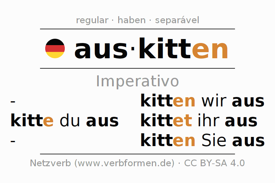 As formas de conjugação do verbo auskitten (vedar, preencher) no imperativo são: kitte (du) aus, kitten wir aus, kittet (ihr) aus, kitten Sie aus
