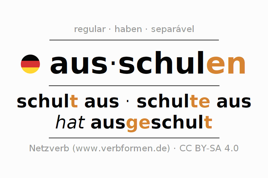 As formas de conjugação do verbo ausschulen (dispensar da escola) no imperativo são: schule (du) aus, schulen wir aus, schult (ihr) aus, schulen Sie aus