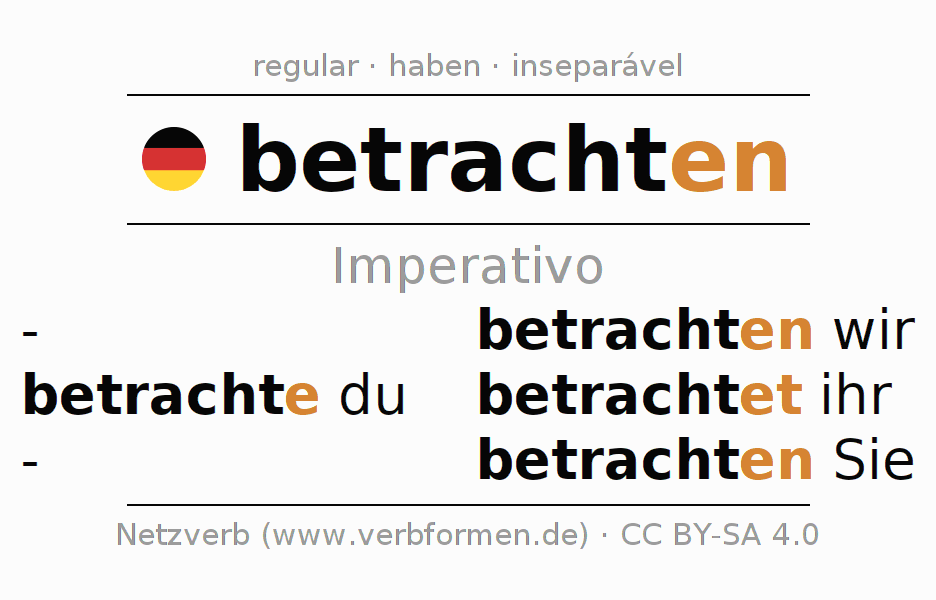 As formas de conjugação do verbo betrachten (considerar, analisar) no imperativo são: betrachte (du), betrachten wir, betrachtet (ihr), betrachten Sie