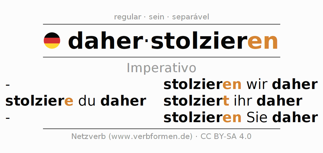 As formas de conjugação do verbo daherstolzieren (andar orgulhosamente) no imperativo são: stolziere (du) daher, stolzieren wir daher, stolziert (ihr) daher, stolzieren Sie daher
