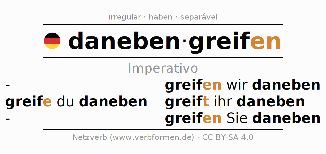 As formas de conjugação do verbo danebengreifen (errar, falhar) no imperativo são: greife (du) daneben, greifen wir daneben, greift (ihr) daneben, greifen Sie daneben