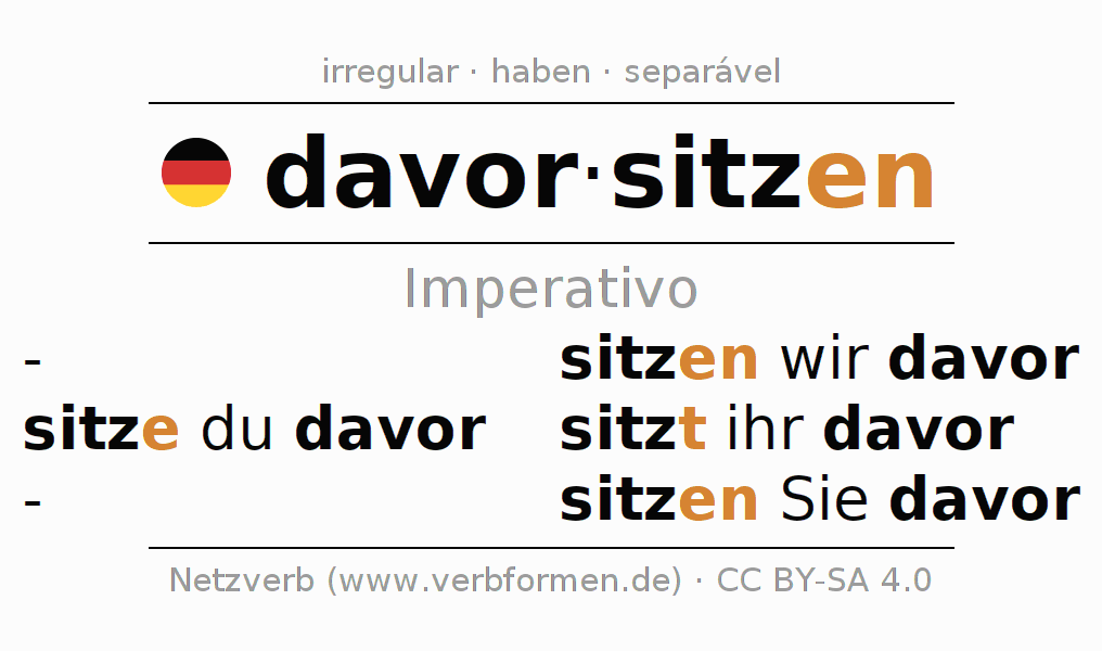 As formas de conjugação do verbo davorsitzen (sentar-se diante) no imperativo são: sitze (du) davor, sitzen wir davor, sitzt (ihr) davor, sitzen Sie davor