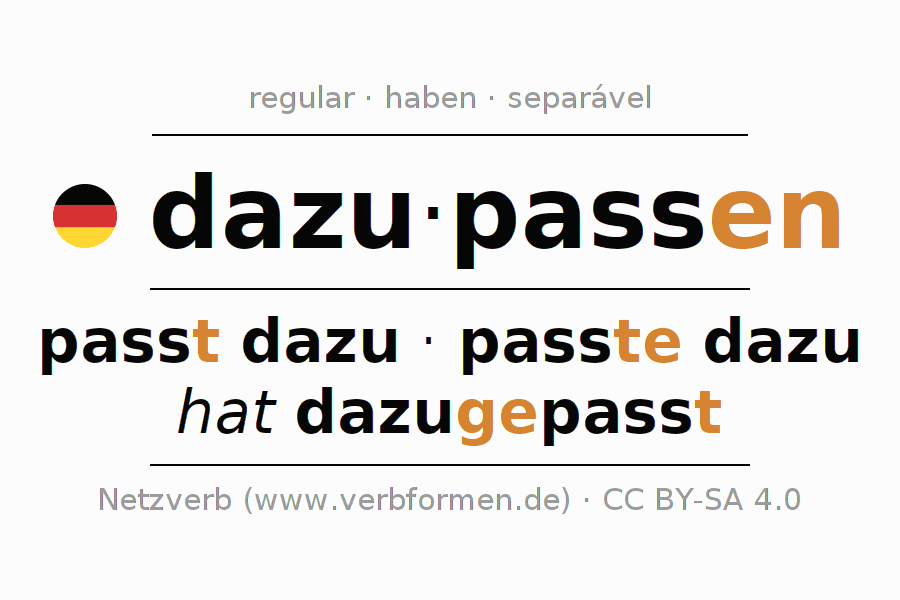 As formas de conjugação do verbo dazupassen (combinar, corresponder) no imperativo são: passe (du) dazu, passen wir dazu, passt (ihr) dazu, passen Sie dazu