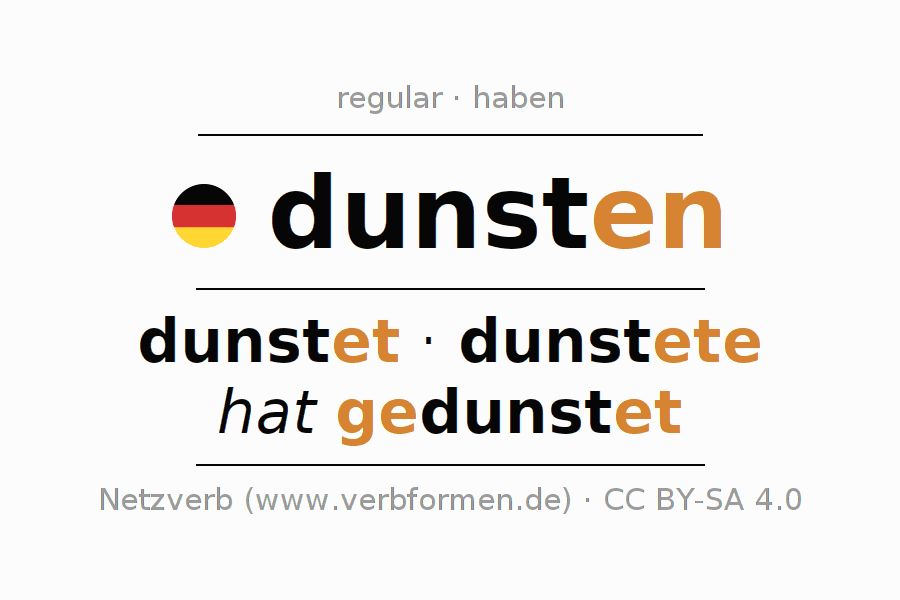 As formas de conjugação do verbo dunsten (emitir, esperar por uma decisão) no imperativo são: dunste (du), dunsten wir, dunstet (ihr), dunsten Sie