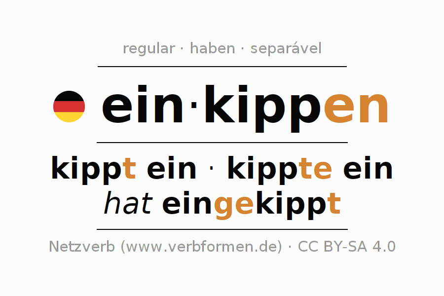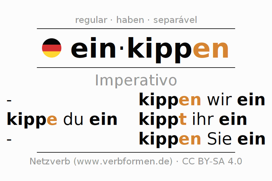 As formas de conjugação do verbo einkippen (despejar, verter) no imperativo são: kippe (du) ein, kippen wir ein, kippt (ihr) ein, kippen Sie ein