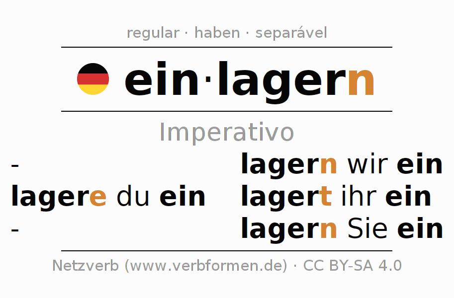 As formas de conjugação do verbo einlagern (armazenar, depositar) no imperativo são: lag(e)re (du) ein, lagern wir ein, lagert (ihr) ein, lagern Sie ein