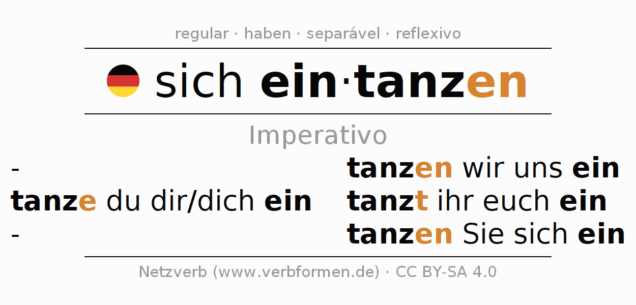O verbo sich eintanzen é totalmente conjugado em todas as pessoas e números no Imperativo Presente