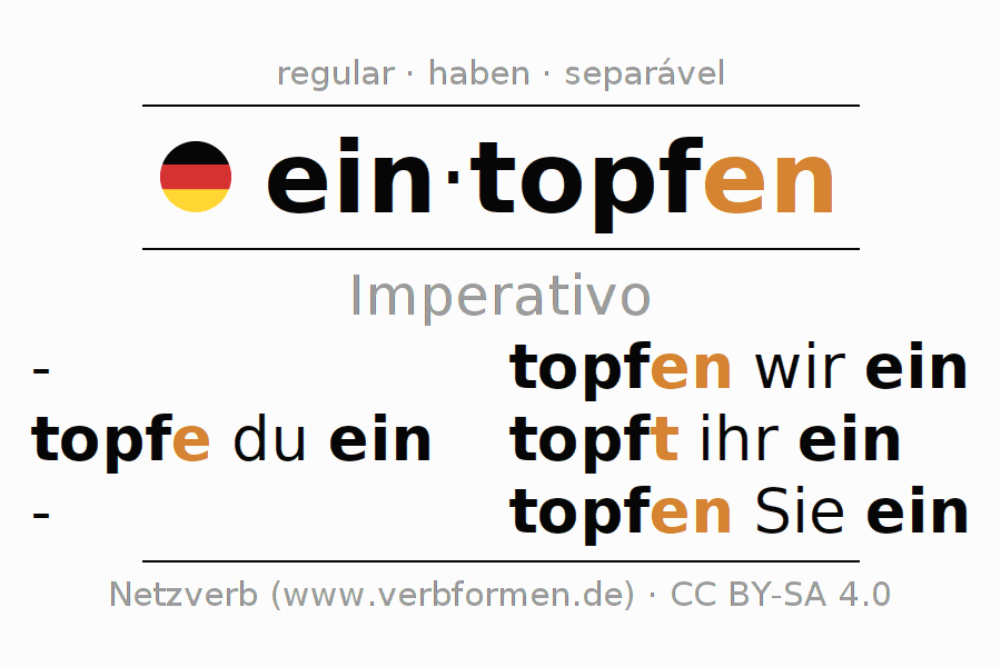 As formas de conjugação do verbo eintopfen (envasar, plantar) no imperativo são: topfe (du) ein, topfen wir ein, topft (ihr) ein, topfen Sie ein