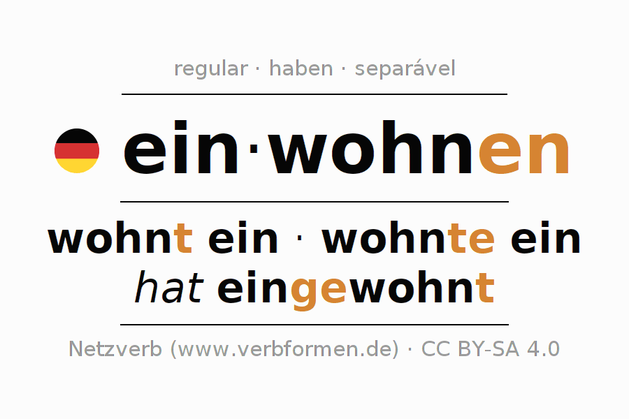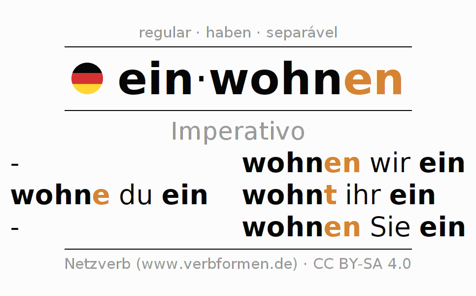 As formas de conjugação do verbo einwohnen (habitar, residir) no imperativo são: wohne (du) ein, wohnen wir ein, wohnt (ihr) ein, wohnen Sie ein