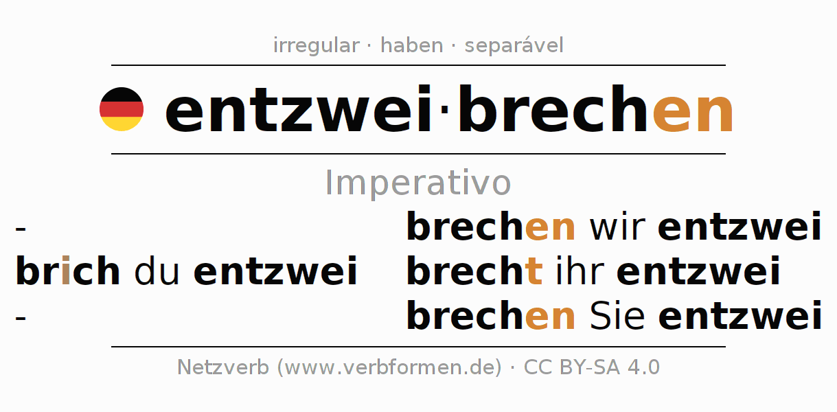 As formas de conjugação do verbo entzweibrechen (partir, partir em pedaços) no imperativo são: brich (du) entzwei, brechen wir entzwei, brecht (ihr) entzwei, brechen Sie entzwei