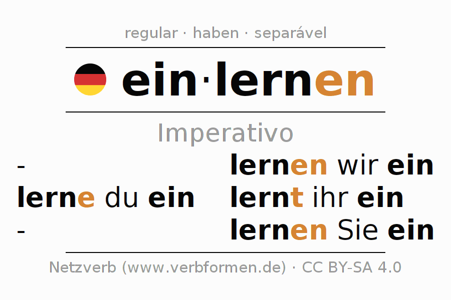 A conjugação do verbo einlernen no Ativo Imperativo Presente Imperativo é: lerne (du) ein, lernen wir ein, lernt (ihr) ein, lernen Sie ein.A formação dessas formas segue determinadas regras gramaticais. Os requisitos para a conjugação do verbo como forma verbal simples no einlernen do Imperativo. Comentários ☆