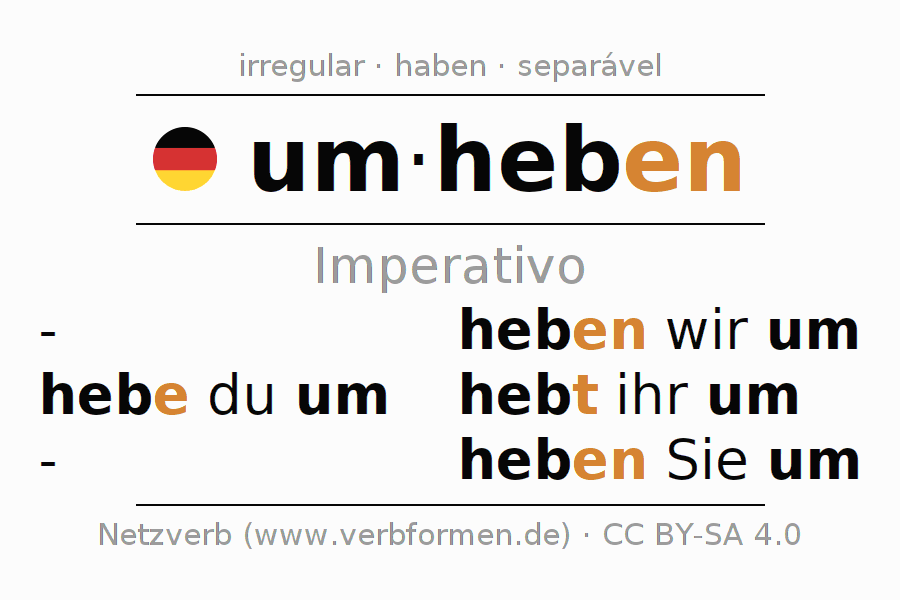 A conjugação do verbo umheben no Ativo Imperativo Presente Imperativo é: hebe (du) um, heben wir um, hebt (ihr) um, heben Sie um.A formação dessas formas segue determinadas regras gramaticais. Os requisitos para a conjugação do verbo como forma verbal simples no umheben do Imperativo. Comentários ☆