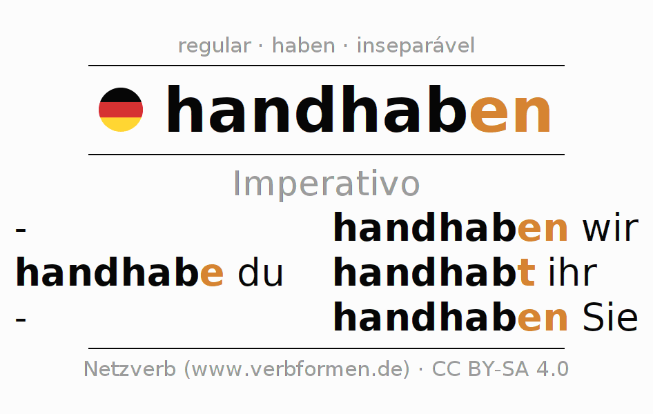 As formas de conjugação do verbo handhaben (manipular, lidar) no imperativo são: handhabe (du), handhaben wir, handhabt (ihr), handhaben Sie