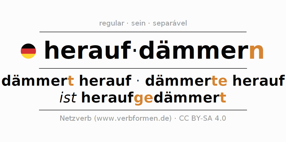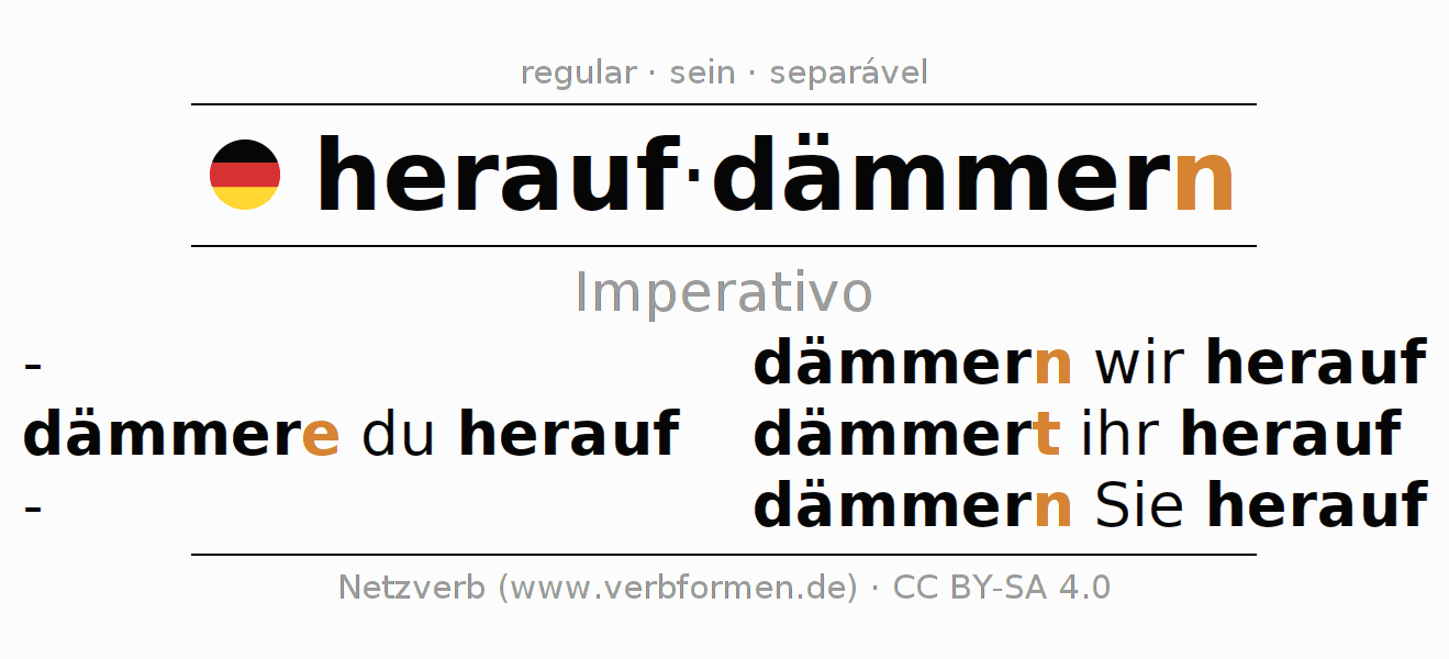 As formas de conjugação do verbo heraufdämmern (clarear, amanhecer) no imperativo são: dämm(e)re (du) herauf, dämmern wir herauf, dämmert (ihr) herauf, dämmern Sie herauf
