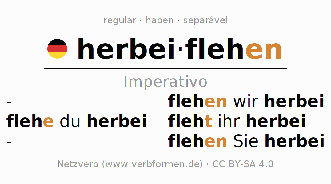 As formas de conjugação do verbo herbeiflehen (implorar, suplicar) no imperativo são: flehe (du) herbei, flehen wir herbei, fleht (ihr) herbei, flehen Sie herbei