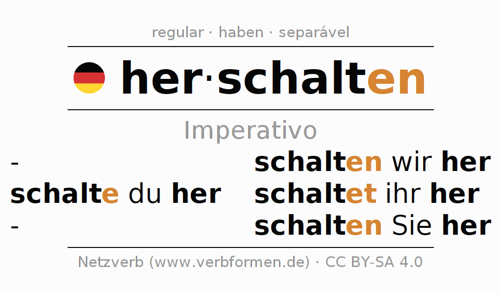 As formas de conjugação do verbo herschalten (alternar para cá, mudar para cá) no imperativo são: schalte (du) her, schalten wir her, schaltet (ihr) her, schalten Sie her