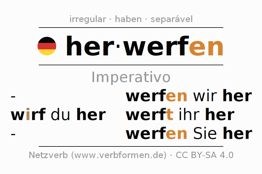 As formas de conjugação do verbo herwerfen (atirar, lançar) no imperativo são: wirf (du) her, werfen wir her, werft (ihr) her, werfen Sie her