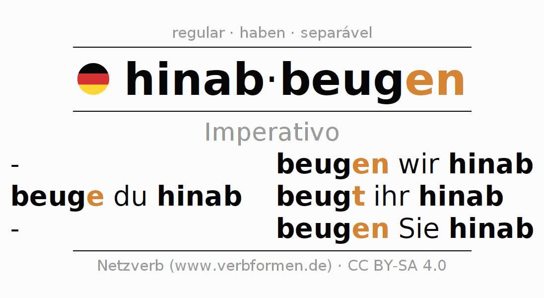 As formas de conjugação do verbo hinabbeugen (inclinar-se para baixo) no imperativo são: beuge (du) hinab, beugen wir hinab, beugt (ihr) hinab, beugen Sie hinab