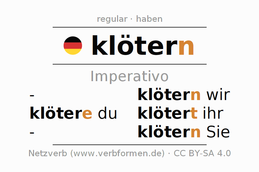 As formas de conjugação do verbo klötern (fazer barulho, ressoar) no imperativo são: klöt(e)re (du), klötern wir, klötert (ihr), klötern Sie