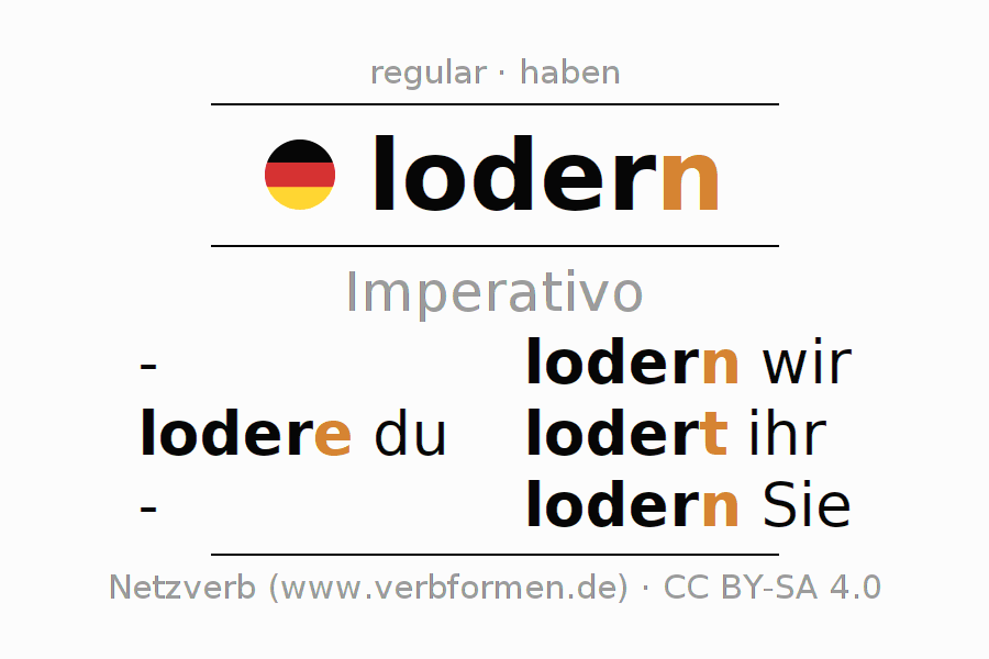 As formas de conjugação do verbo lodern (flamejar, arder) no imperativo são: lod(e)re (du), lodern wir, lodert (ihr), lodern Sie