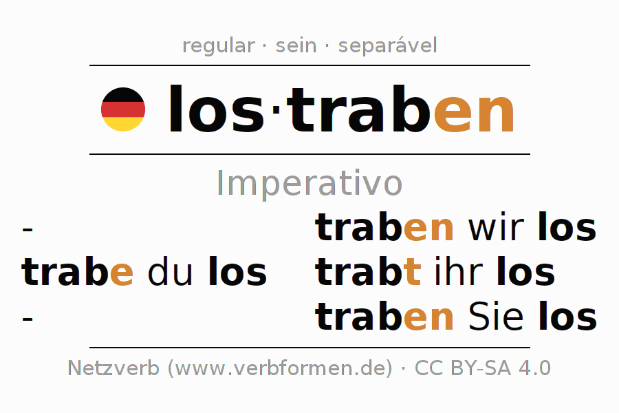 As formas de conjugação do verbo lostraben (partir rapidamente, sair correndo) no imperativo são: trabe (du) los, traben wir los, trabt (ihr) los, traben Sie los