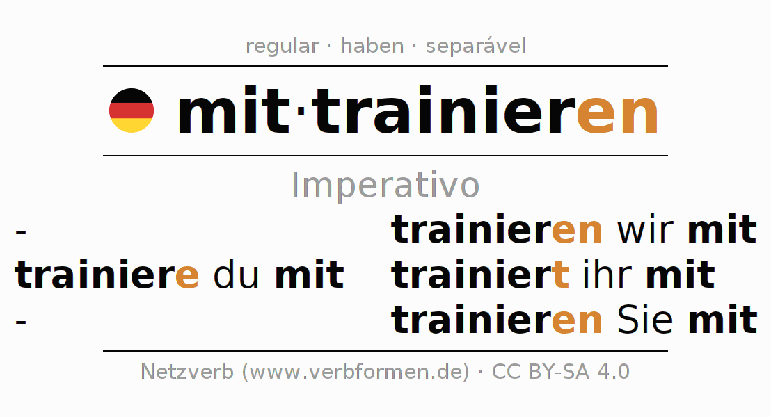 As formas de conjugação do verbo mittrainieren (treinar junto) no imperativo são: trainiere (du) mit, trainieren wir mit, trainiert (ihr) mit, trainieren Sie mit