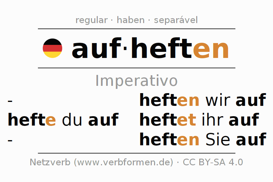 A conjugação do verbo aufheften no Ativo Imperativo Presente Imperativo é: hefte (du) auf, heften wir auf, heftet (ihr) auf, heften Sie auf.A formação dessas formas segue determinadas regras gramaticais. Os requisitos para a conjugação do verbo como forma verbal simples no aufheften do Imperativo. Comentários ☆