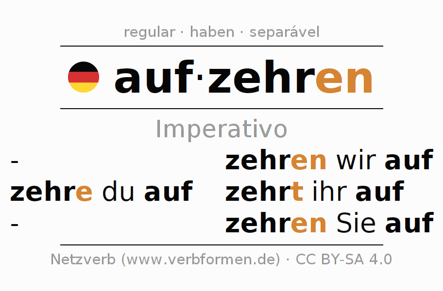 A conjugação do verbo aufzehren no Ativo Imperativo Presente Imperativo é: zehre (du) auf, zehren wir auf, zehrt (ihr) auf, zehren Sie auf.A formação dessas formas segue determinadas regras gramaticais. Os requisitos para a conjugação do verbo como forma verbal simples no aufzehren do Imperativo. Comentários ☆