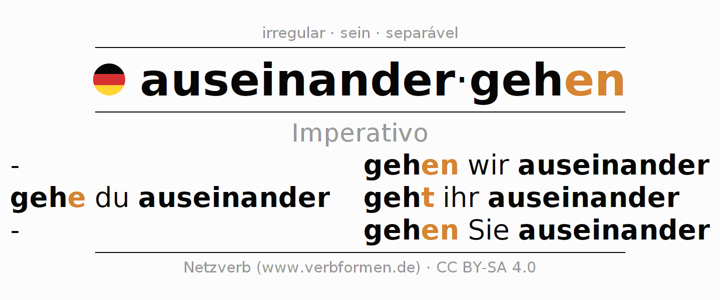 A conjugação do verbo auseinandergehen no Ativo Imperativo Presente Imperativo é: gehe (du) auseinander, gehen wir auseinander, geht (ihr) auseinander, gehen Sie auseinander.A formação dessas formas segue determinadas regras gramaticais. Os requisitos para a conjugação do verbo como forma verbal simples no auseinandergehen do Imperativo. Comentários ☆