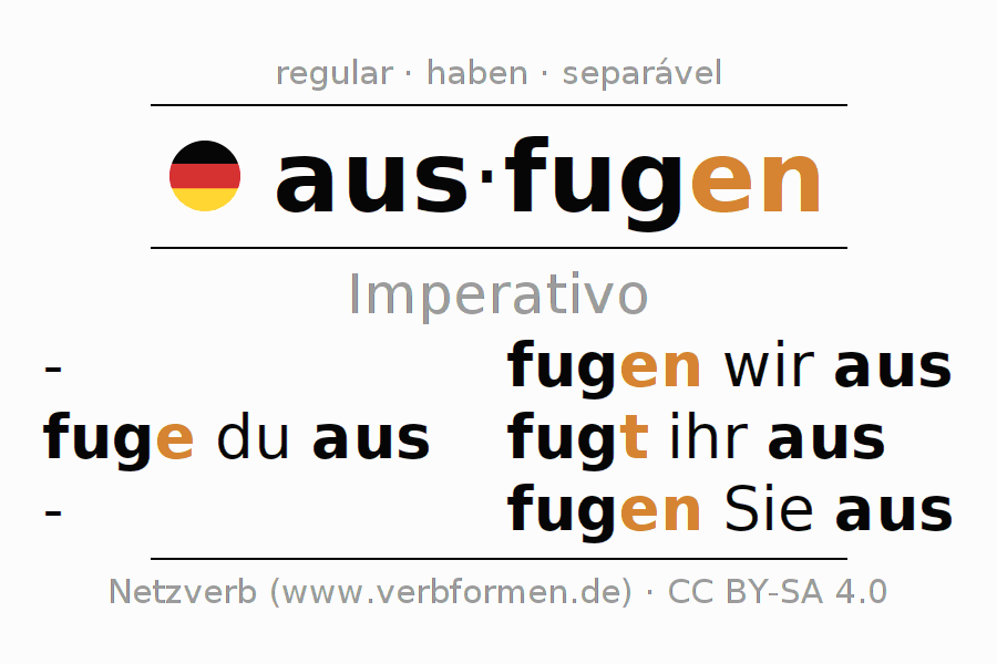 A conjugação do verbo ausfugen no Ativo Imperativo Presente Imperativo é: fuge (du) aus, fugen wir aus, fugt (ihr) aus, fugen Sie aus.A formação dessas formas segue determinadas regras gramaticais. Os requisitos para a conjugação do verbo como forma verbal simples no ausfugen do Imperativo. Comentários ☆