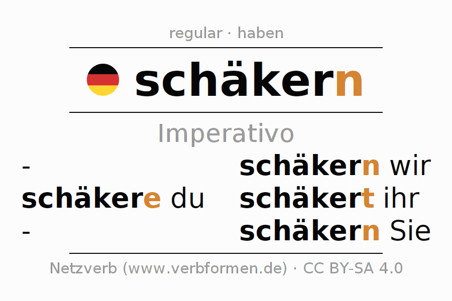 A conjugação do verbo schäkern no Ativo Imperativo Presente Imperativo é: schäk(e)re (du), schäkern wir, schäkert (ihr), schäkern Sie.A formação dessas formas segue determinadas regras gramaticais. Os requisitos para a conjugação do verbo como forma verbal simples no schäkern do Imperativo. Comentários ☆