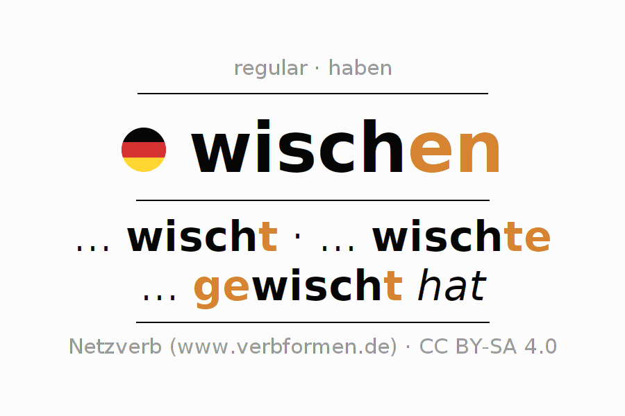 A conjugação do verbo wischen no Ativo Imperativo Presente Imperativo é: wische (du), wischen wir, wischt (ihr), wischen Sie.A formação dessas formas segue determinadas regras gramaticais. Os requisitos para a conjugação do verbo como forma verbal simples no wischen do Imperativo. Comentários ☆