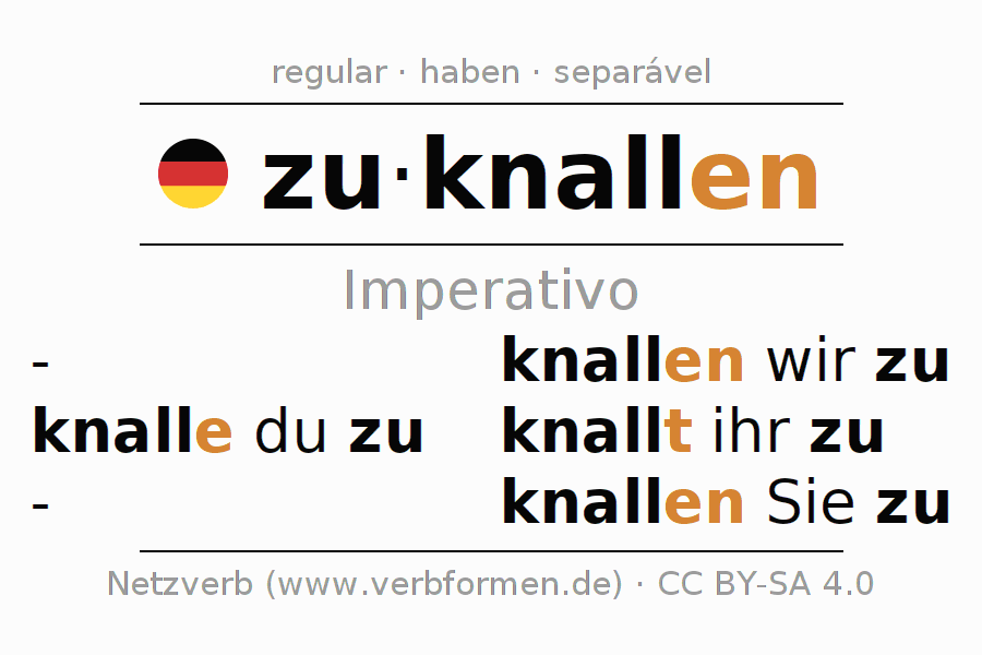 A conjugação do verbo zuknallen no Ativo Imperativo Presente Imperativo é: knalle (du) zu, knallen wir zu, knallt (ihr) zu, knallen Sie zu.A formação dessas formas segue determinadas regras gramaticais. Os requisitos para a conjugação do verbo como forma verbal simples no zuknallen do Imperativo. Comentários ☆