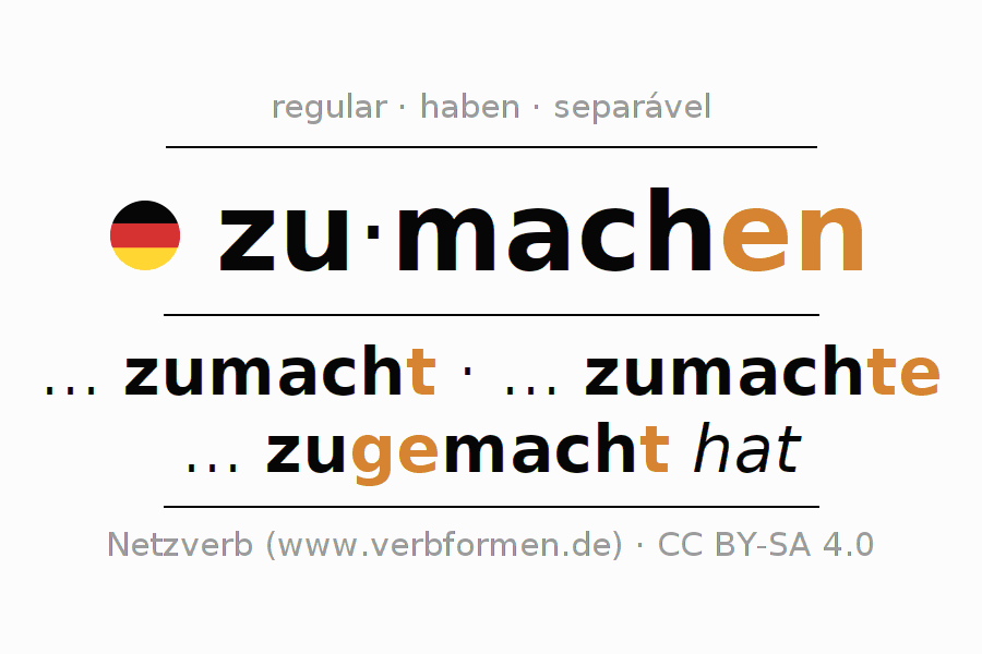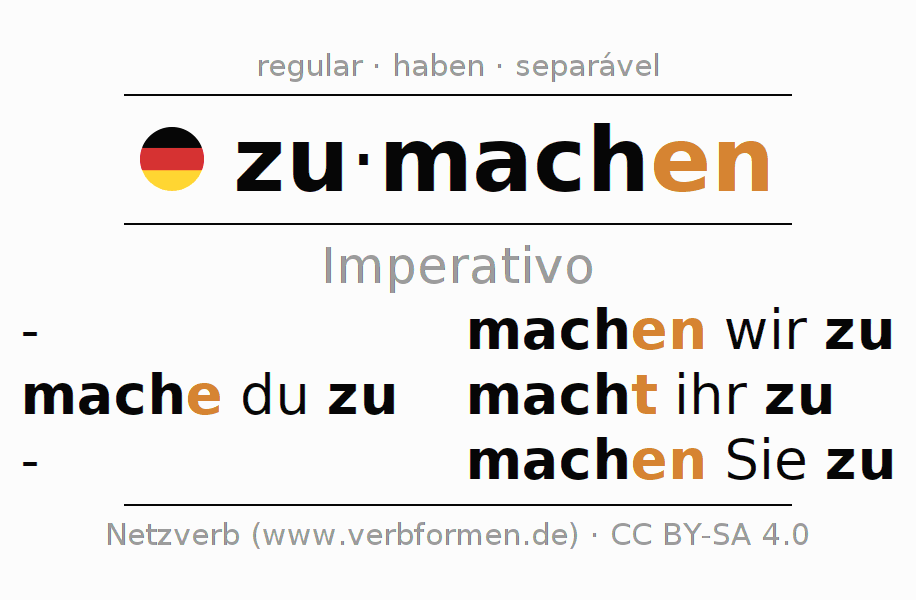 A conjugação do verbo zumachen no Ativo Imperativo Presente Imperativo é: mache (du) zu, machen wir zu, macht (ihr) zu, machen Sie zu.A formação dessas formas segue determinadas regras gramaticais. Os requisitos para a conjugação do verbo como forma verbal simples no zumachen do Imperativo. Comentários ☆