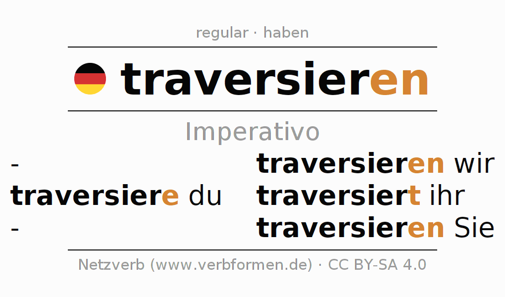 As formas de conjugação do verbo traversieren (traversar, cavalgar diagonalmente) no imperativo são: traversiere (du), traversieren wir, traversiert (ihr), traversieren Sie