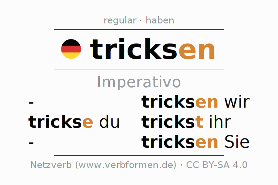 As formas de conjugação do verbo tricksen (trapacear, enganar) no imperativo são: trickse (du), tricksen wir, trickst (ihr), tricksen Sie
