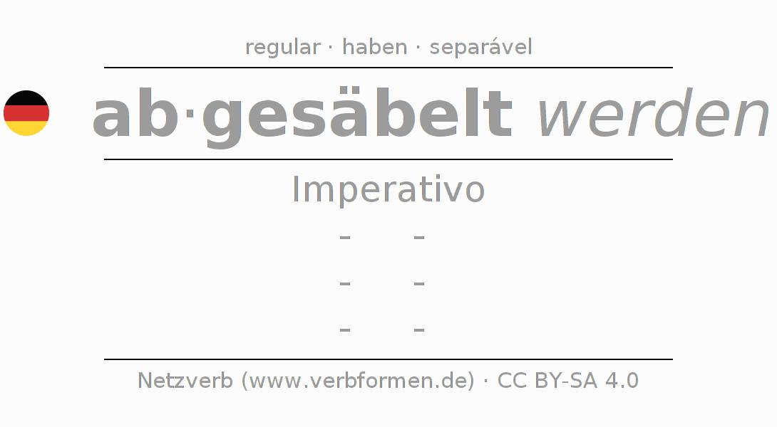 A conjugação do verbo absäbeln no Voz Passiva Imperativo Presente Imperativo é: -, -, -, -.A formação dessas formas segue determinadas regras gramaticais. Os requisitos para a conjugação do verbo como forma verbal simples no absäbeln do Imperativo. Comentários ☆