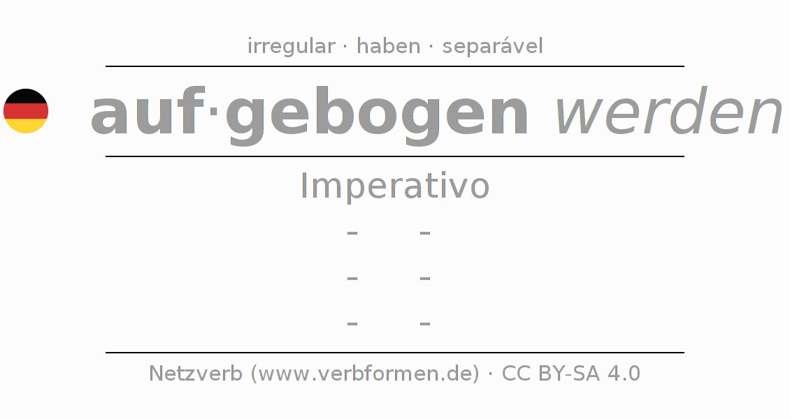 A conjugação do verbo aufbiegen no Voz Passiva Imperativo Presente Imperativo é: -, -, -, -.A formação dessas formas segue determinadas regras gramaticais. Os requisitos para a conjugação do verbo como forma verbal simples no aufbiegen do Imperativo. Comentários ☆