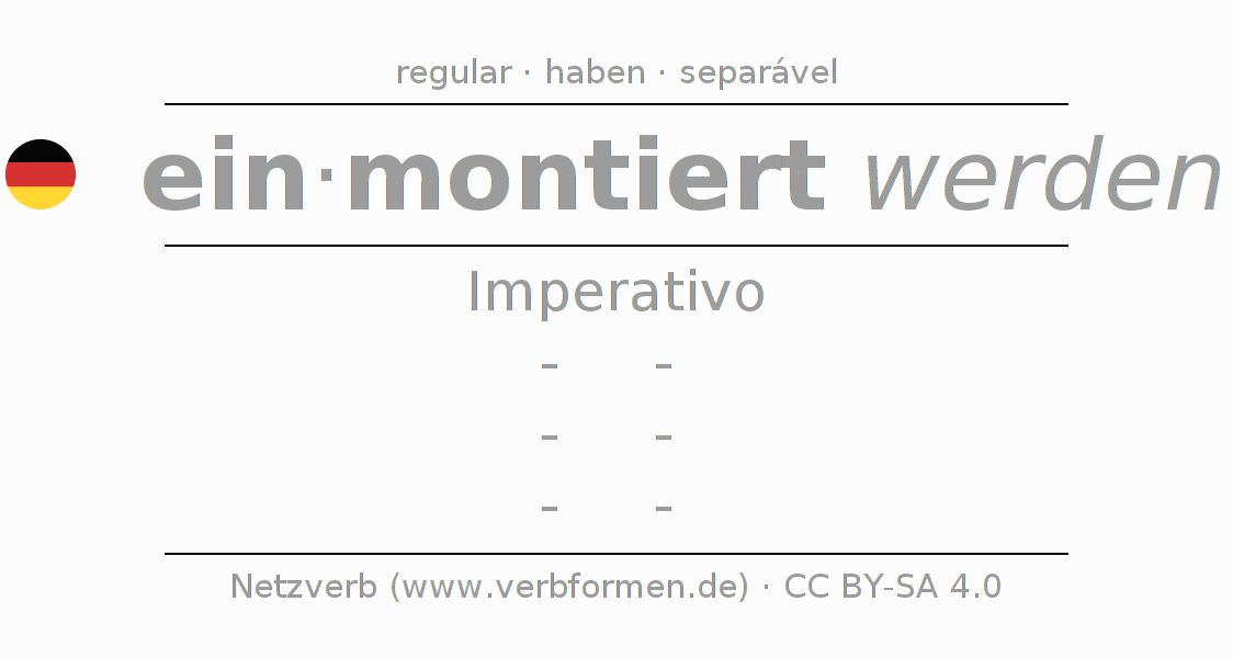 A conjugação do verbo einmontieren no Voz Passiva Imperativo Presente Imperativo é: -, -, -, -.A formação dessas formas segue determinadas regras gramaticais. Os requisitos para a conjugação do verbo como forma verbal simples no einmontieren do Imperativo. Comentários ☆