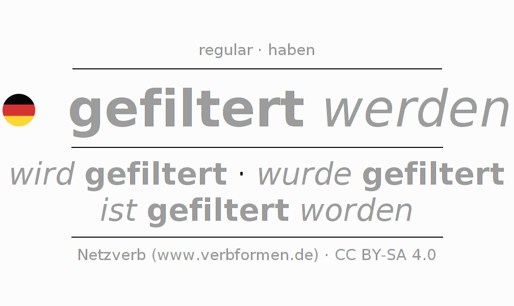 A conjugação do verbo filtern no Voz Passiva Imperativo Presente Imperativo é: -, -, -, -.A formação dessas formas segue determinadas regras gramaticais. Os requisitos para a conjugação do verbo como forma verbal simples no filtern do Imperativo. Comentários ☆
