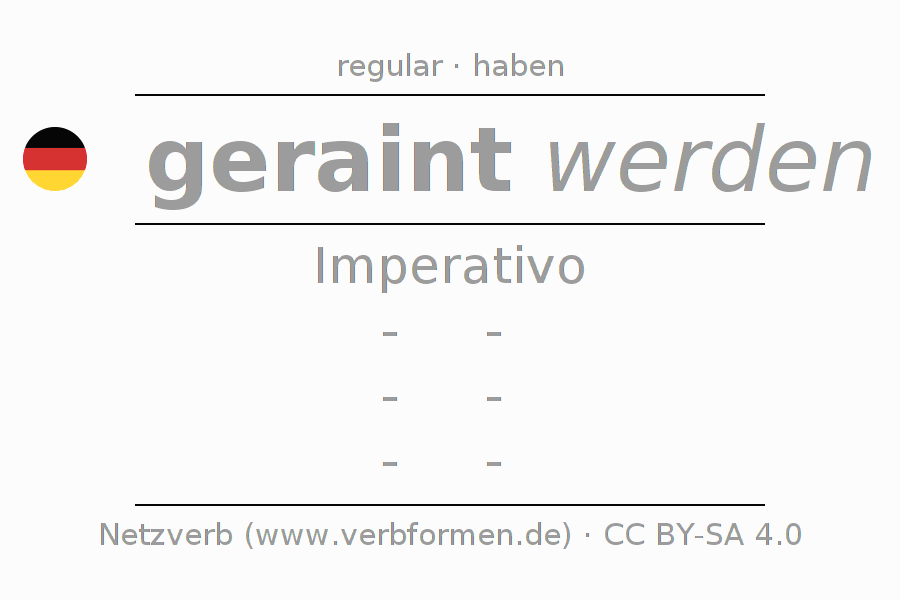A conjugação do verbo rainen no Voz Passiva Imperativo Presente Imperativo é: -, -, -, -.A formação dessas formas segue determinadas regras gramaticais. Os requisitos para a conjugação do verbo como forma verbal simples no rainen do Imperativo. Comentários ☆