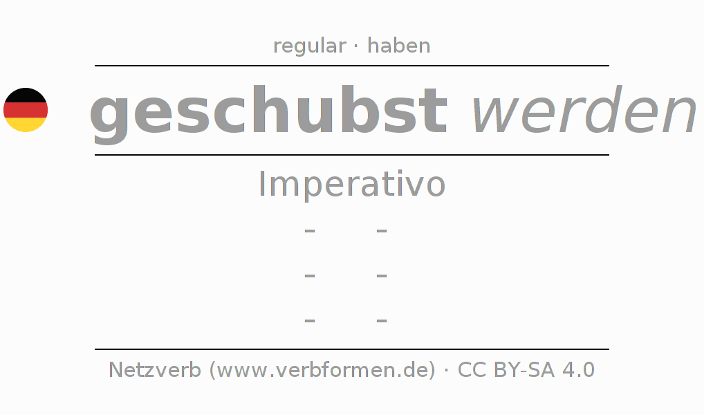 A conjugação do verbo schubsen no Voz Passiva Imperativo Presente Imperativo é: -, -, -, -.A formação dessas formas segue determinadas regras gramaticais. Os requisitos para a conjugação do verbo como forma verbal simples no schubsen do Imperativo. Comentários ☆