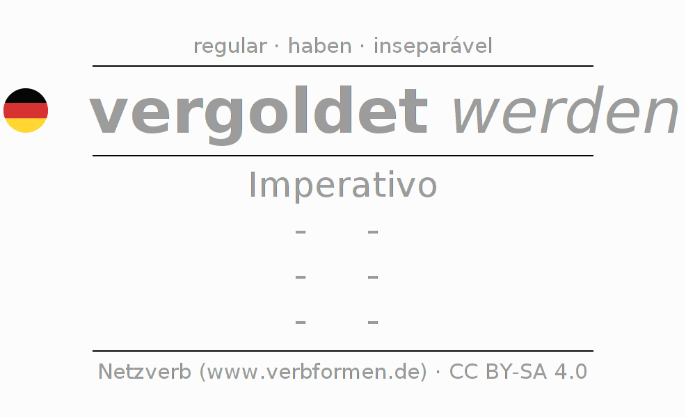 A conjugação do verbo vergolden no Voz Passiva Imperativo Presente Imperativo é: -, -, -, -.A formação dessas formas segue determinadas regras gramaticais. Os requisitos para a conjugação do verbo como forma verbal simples no vergolden do Imperativo. Comentários ☆