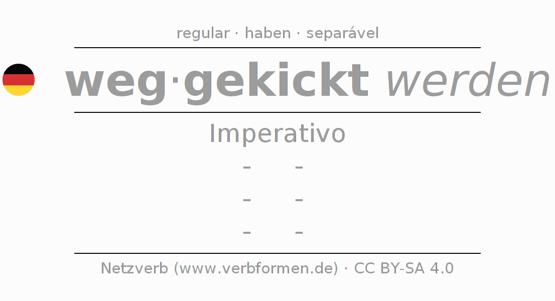 A conjugação do verbo wegkicken no Voz Passiva Imperativo Presente Imperativo é: -, -, -, -.A formação dessas formas segue determinadas regras gramaticais. Os requisitos para a conjugação do verbo como forma verbal simples no wegkicken do Imperativo. Comentários ☆