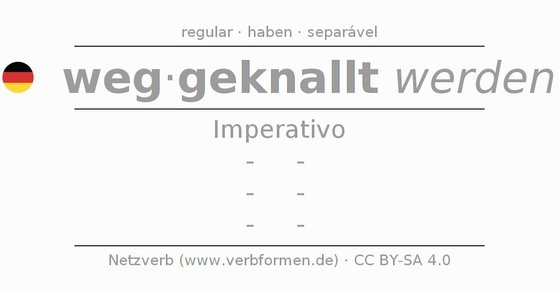 A conjugação do verbo wegknallen no Voz Passiva Imperativo Presente Imperativo é: -, -, -, -.A formação dessas formas segue determinadas regras gramaticais. Os requisitos para a conjugação do verbo como forma verbal simples no wegknallen do Imperativo. Comentários ☆