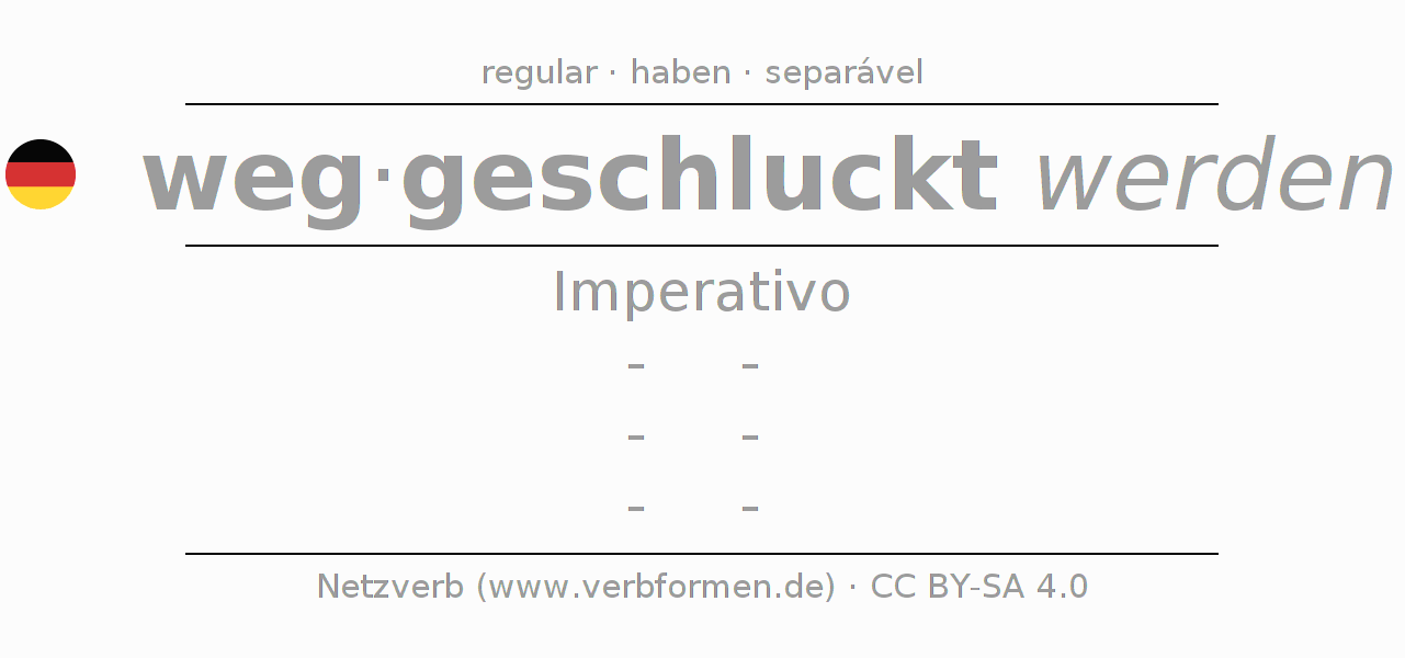 A conjugação do verbo wegschlucken no Voz Passiva Imperativo Presente Imperativo é: -, -, -, -.A formação dessas formas segue determinadas regras gramaticais. Os requisitos para a conjugação do verbo como forma verbal simples no wegschlucken do Imperativo. Comentários ☆