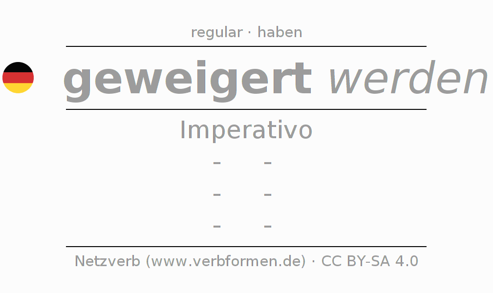A conjugação do verbo weigern no Voz Passiva Imperativo Presente Imperativo é: -, -, -, -.A formação dessas formas segue determinadas regras gramaticais. Os requisitos para a conjugação do verbo como forma verbal simples no weigern do Imperativo. Comentários ☆