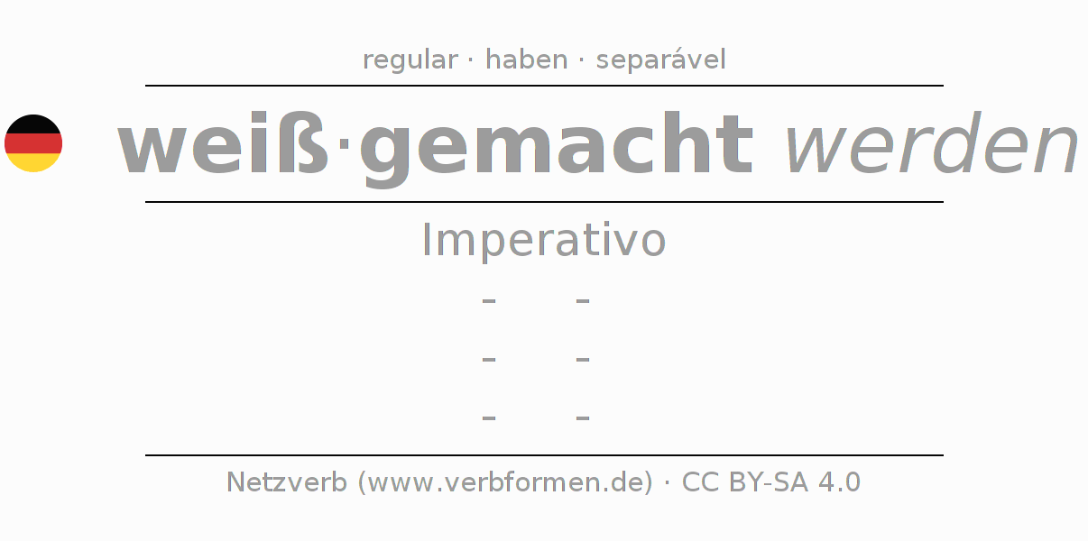 A conjugação do verbo weißmachen no Voz Passiva Imperativo Presente Imperativo é: -, -, -, -.A formação dessas formas segue determinadas regras gramaticais. Os requisitos para a conjugação do verbo como forma verbal simples no weißmachen do Imperativo. Comentários ☆